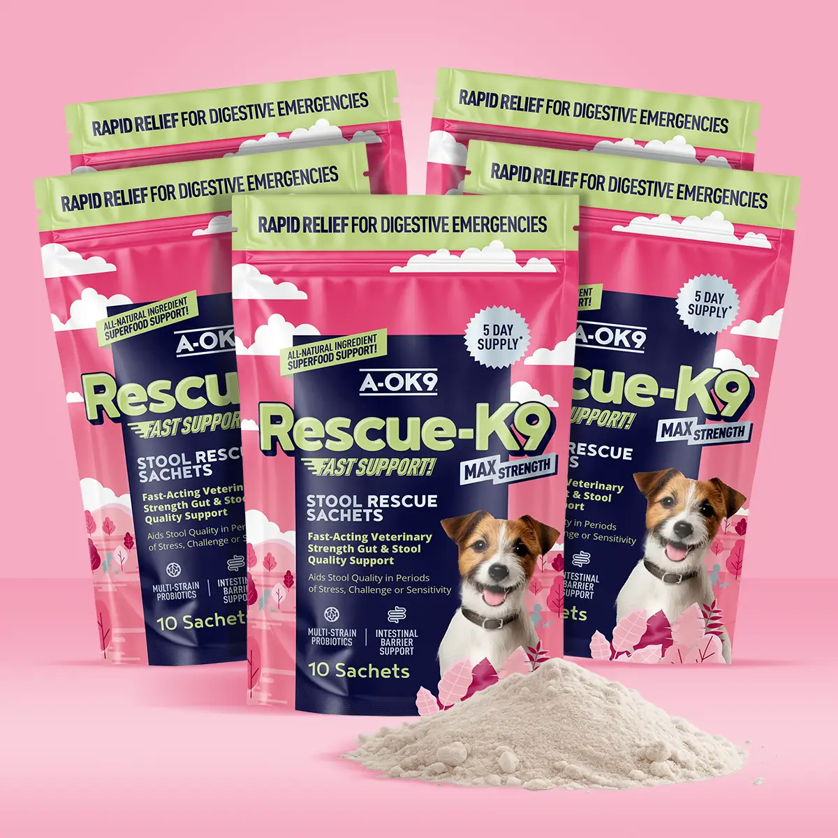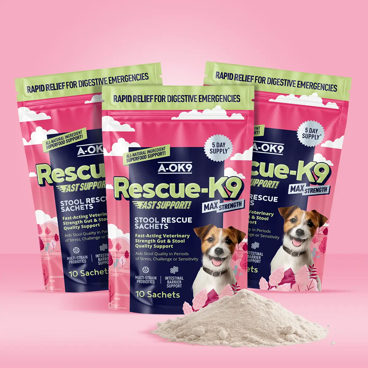 Support your dog's digestive health with Rescue-K9 Max - 10 sachets. Our fast-acting supplement includes probiotics & prebiotics to aid rapid recovery from digestive upsets