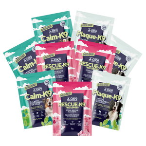 ![Sample Travel Packs Multi Pack [3xCalm-K9, 3xPlaque-K9, 3xRescue-K9]](http://a-ok9.com/cdn/shop/files/aok9_Web_RescueSachet_ProductIngredients_1200x.png?v=1752640437)