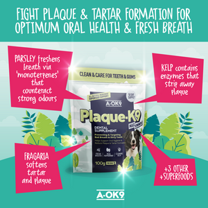 Maintain your dog's oral health naturally with Plaque-K9. Our daily supplement combines sea kelp, fennel & other superfoods to reduce plaque, tartar & bad breath.