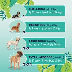 | Xtra Large Dogs (41kg +) | 5g (1 ¼ teaspoons) | 20 days |