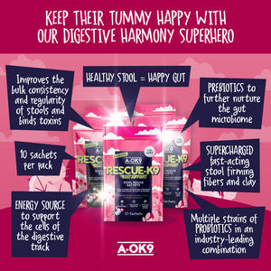 Support your dog's digestive health with Rescue-K9 Max - 10 sachets. Our fast-acting supplement includes probiotics & prebiotics to aid rapid recovery from digestive upsets