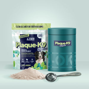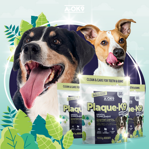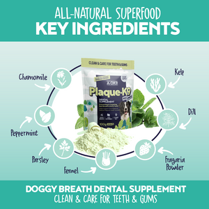 Maintain your dog's oral health naturally with Plaque-K9. Our daily supplement combines sea kelp, fennel & other superfoods to reduce plaque, tartar & bad breath.