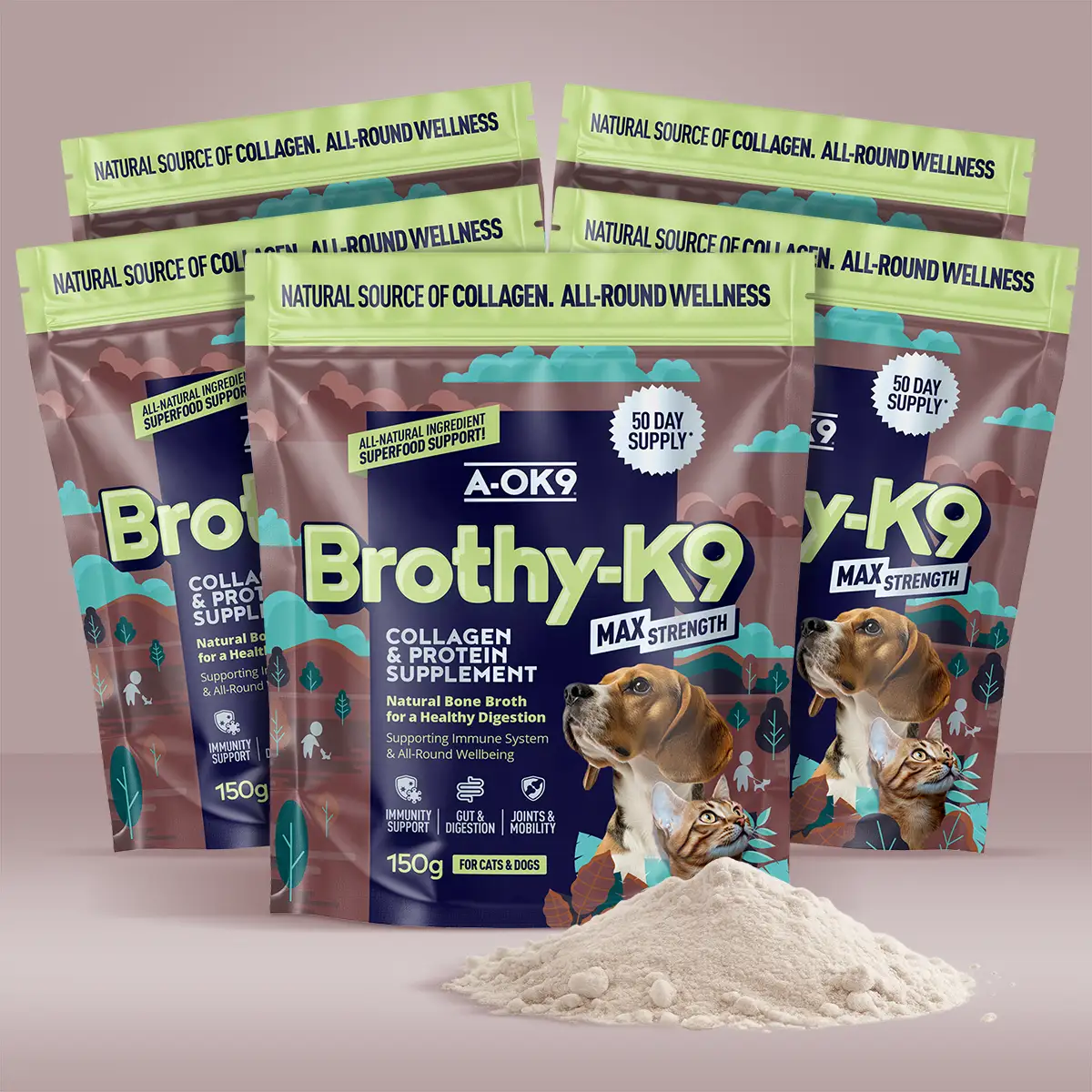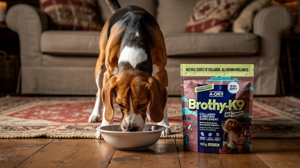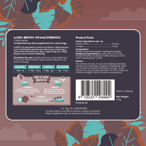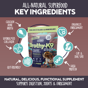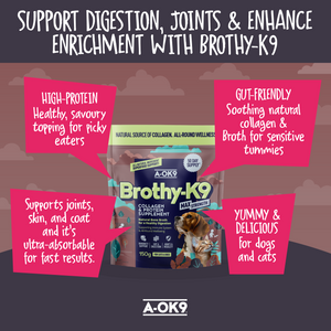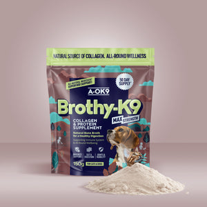 Brothy-K9 is a high-protein bone broth supplement for dogs and cats, packed with natural collagen to support joints, digestion, immunity, and all-around wellness.