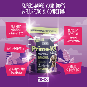 Prime-K9 Max Strength is the ultimate supplement for your dog to promote all round health and wellbeing. The 100% natural and organic blend of superfoods supports wellness from the inside out, to aid a stronger immune system, boost natural defences and contribute to long-term vitality. Suitable for dogs of all ages, sizes and breeds, from puppies through to senior dogs, simply measure the recommended amount for your dog and mix into their feed. Made in the UK formulated by canine nutritionists, the immunity boosting Echinacea, powerful Omega-3 and gut friendly Probiotics help to keep your dog feeling vibrant and active. Support your dog from the inside out with Prime-K9 Max Strength.