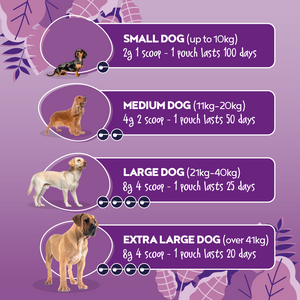 | Xtra Large Dogs (41kg +) | 10g (2 ½ teaspoons) | 20 days |