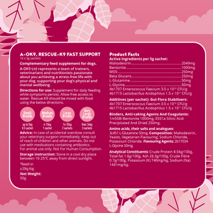 Rescue-K9 Max Strength is the superhero of the probiotic world. There’s a lot of power packed into that little sachet to provide your dog with fast action relief with a powerful blend of super firming fibres to improve the consistency and regularity of stools, multiple strains of probiotics supported with prebiotics to restore the natural gut microbiome, and an energy source to support the cells of the digestive tract.