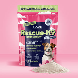 Support your dog's digestive health with Rescue-K9 Max - 10 sachets. Our fast-acting supplement includes probiotics & prebiotics to aid rapid recovery from digestive upsets